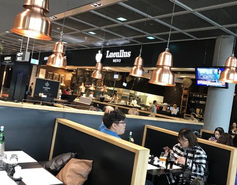 这是机场内的餐厅,餐厅是全开放式的~ 因为整个机场空旷而干净,所以餐厅也很明亮干净,加分不少~ 环境是不错~ 不过服务一般,欧洲人的食欲不是很大的,基本上点杯喝的都能耗上一下午~ 这个餐厅很不符合欧洲民情,不点正餐食物,不能入座的,只能选择其它咖啡馆,呵呵哒~ 如此理由赶顾客的,也是第一次遇到,包括在国内也很少有这样的事了~