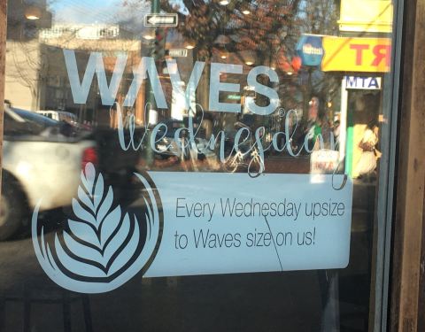 这一家Waves Coffee House身处唐人街,与Downtown、Broadway街等处的分店不同,外墙有些破败,玻璃上有涂鸦的痕迹。好在促销活动还算给力:每周三的咖啡可以免费升级为大杯。