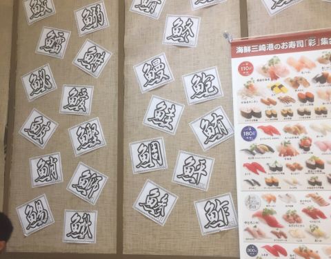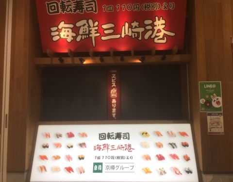 日本东京都江东区著名的砂町银座商店街附近的大型购物中心内餐饮街上的回转式寿司店:海鲜三崎港。大多数寿司一盘两个110日元,也有部分上等海鲜寿司498日元一盘;种类很多,非常过瘾的接地气名店