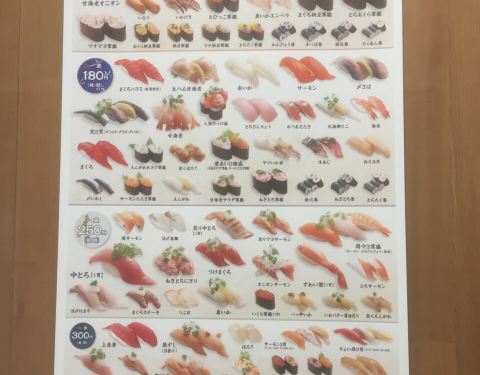 种类很多,非常过瘾的接地气名店。大多数寿司一盘两个110日元,也有部分上等海鲜寿司498日元一盘