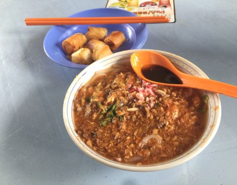 亚三叻沙 (Assam Laksa)是Laksa的其中一个种类,在槟城比较普遍。“Asam”在马来文中意味“酸”,味道较酸也较辣。亚三叻沙就是用鱼熬出来、略带酸味的浓汤。亚三叻沙一般搭配米线或米粉。 湾岛头在一个茶餐厅里面。茶餐厅还有其他不同类型的小吃,不同老板的,只是客人都坐在茶餐厅里面吃饭,你爱点哪一家的食物都可以。 湾岛头生意还不错,看老板飞速的手势,一分钟可以做好几碗叻沙。他们家的叻沙汤底比较辣,感觉比吉隆坡的口味偏重,也算是能接受的口味。汤底没什么配菜,几乎纯叻沙汤……不过价格真的便宜!5元一碗。 他们家的炸春卷不错,里面的馅料很好吃,春卷皮也炸的酥脆。 总体觉得出品还不错,极具特色。就是就餐环境有点热。