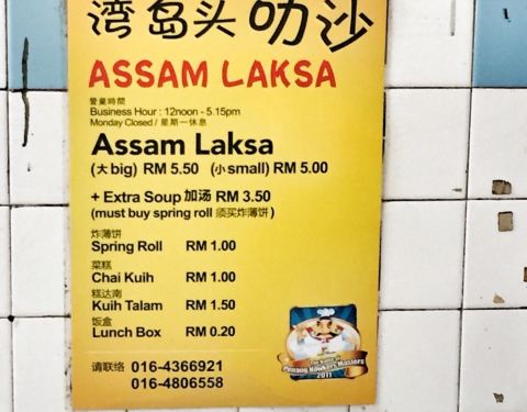 亚三叻沙 (Assam Laksa)是Laksa的其中一个种类,在槟城比较普遍。“Asam”在马来文中意味“酸”,味道较酸也较辣。亚三叻沙就是用鱼熬出来、略带酸味的浓汤。亚三叻沙一般搭配米线或米粉。 湾岛头在一个茶餐厅...