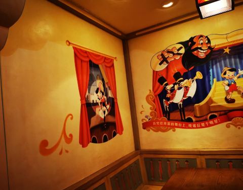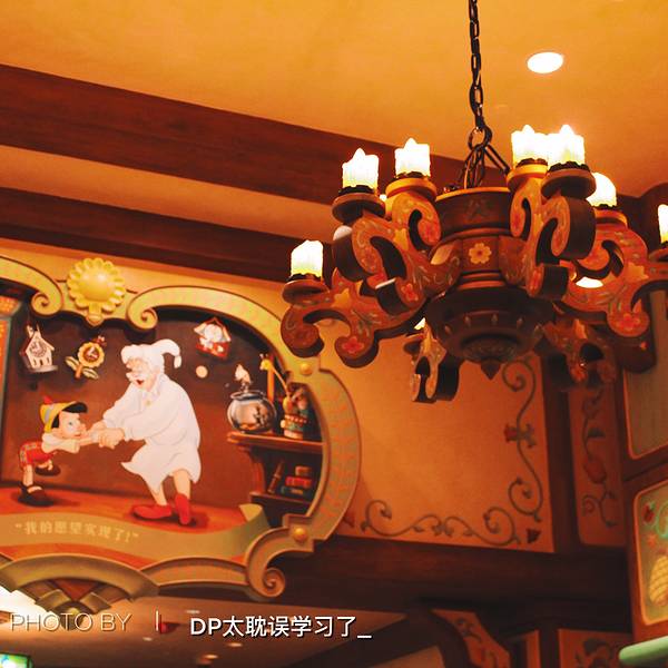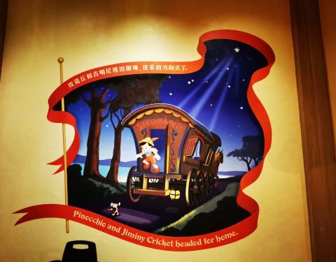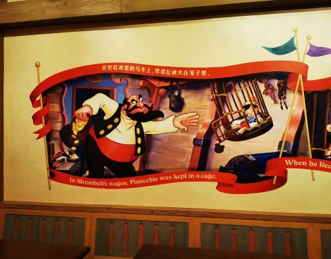 迪士尼乐园里,非常有特色的餐厅,以匹诺曹动画片作为背景,设计的餐厅,墙面上就是故事介绍。从匹诺曹的由来开始,到他终于回到家!餐厅吃的种类比较多,披萨,面条,炒饭,最近还有夏季特饮,非常好看!值得一来!