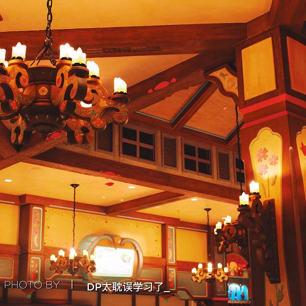 坐落于梦幻世界区域,在城堡的斜后方,对面是可以坐船游玩的晶彩奇航项目。适合合家欢,提供米奇形状的比萨,面条,饭食等。亦有选择丰富的儿童套餐,是小号的米奇头形状的比萨。 【口味】套餐多种多样。点了两款比萨,老北京烤鸭味和川香辣味。味道还不错。 【环境】是皮诺丘的主题餐厅,室内室外均可就餐。家具都是故事里面的木质造型。餐厅壁画都是皮诺丘的故事。 【服务】态度很好。提供免费的开水。吃不完的可打包,有米奇图案的打包盒免费。