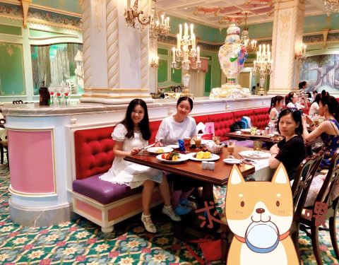 像进入童话的城堡里,皇家宫廷风格的设计,餐厅非常的美,环境很好,服务也不错,当然,价格也并不低,套餐二三百块钱,饮料都要好几十,主要就是一种体验,很多东西都做成了米奇的图案