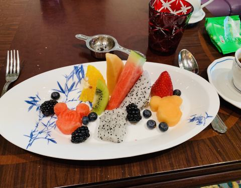 皇家宴会厅位于迪士尼中央城堡的二楼,一楼有神秘人物可以合影。餐厅位置需要预定,有三道菜套餐和两道菜套餐可选,味口好的人可以选三套菜的套餐,有各种品种的搭配,味道还不错。摆盘很精致,有各种迪士尼元素,但甜品有点腻。吃饭途中会有迪士尼人物们来合影,是一个很不错的选择。