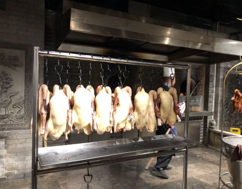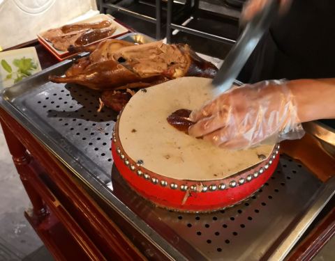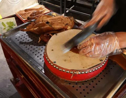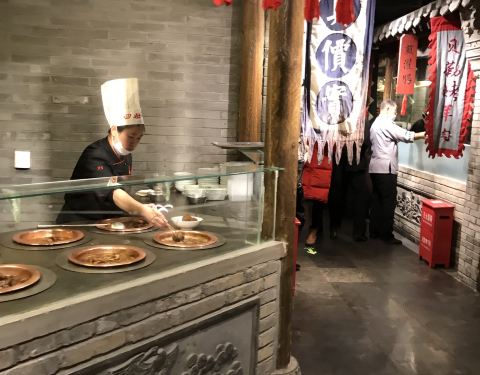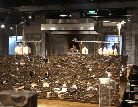 这次北京出差中间有个短时间自由时间,约着合作伙伴一起找到这家酒店。停车场在地下,如果走好了,上来就是这家酒店。酒店一楼是迎宾的地方,上二楼就餐点餐。店铺整体装修的比较有特色古香古色的,服务员也是复古式的衣服。基本都是PAD点菜,有些特色小吃可以看得到加工。点了几道色特菜品,还算中规中矩的,芥末墩子味道一般,芥末味道调的不散正。烤鸭在鼓上片,说是刀工好鼓不会碎。上前仔细看了一下,鼓面是可以换的那种,破了也可以换,噱头比较多。蘸料有点少,再点另收费,晚上据说有表演,可惜没有机会看了。