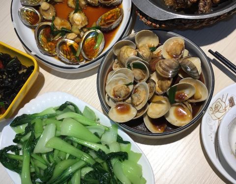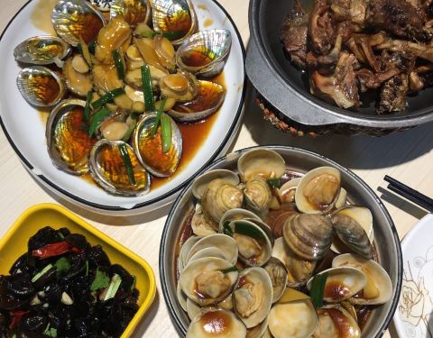 在网上买的套餐,价钱相当实惠,不到150有炒花甲、、炒鲍鱼、姜母鸭、炒青菜和米饭。 鲍鱼和花甲都很新鲜,味道也好;姜母鸭也可以,就是煮得太干了肉都不见了。蔬菜碧绿,而且炒得很香,味道很好,连蒜蓉都吃光啦。 服务态度很好,工作效率超高,下单之后菜一转眼就上齐了,就算赶飞机也不怕被耽误。