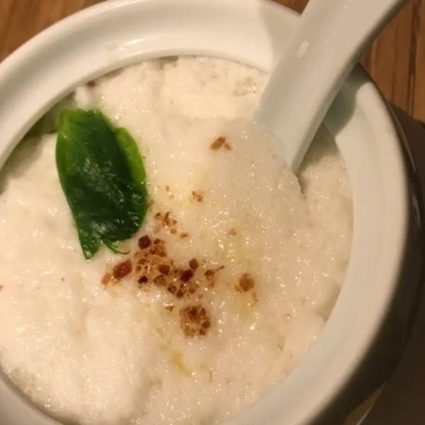 鸡豆花一人一份,挺精致的,应该是我最喜欢的一道菜了!好像上面是鸡胸肉和豆花打碎下面是鸡汤?反正挺清淡的,老人小孩也能吃