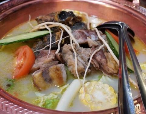 食全酒美·十年老字号腊排骨火锅 看了攻略说,到云南就一定要吃腊排骨锅,终于到了这家攻略里推荐的,等了大概10多分钟,不过真是不负众望,环境美美的,吃着水性杨花,喝花酒,非常幸福,主要老板特别好,我们自带的佛手打不开,老板主动给我们拿刀,还告诉我们怎么吃,做为外地人一下被温暖到。 下面就让我给大家分享分享一下他们家的美味吧! 腊排骨:我们点的是干锅的腊排骨,很好吃,有一点点辣辣的,跟汤的相比我觉得会香一点,里面就是排骨和一些配菜,小小的菌菇也超级好吃,锅里的肉吃的差不多了他就会给你加汤,然后就可以加一些自己点的配菜了。 青梅酒:点饮品的时候点了他们自制的梅子酒,酸酸甜甜,酒味不是很重,真的很完美。 推荐:腊排骨青梅酒蘸料纳西烤肉