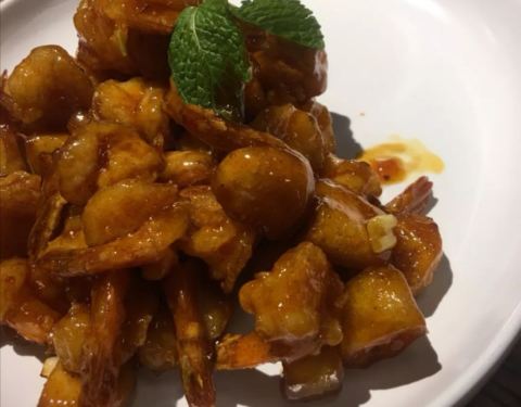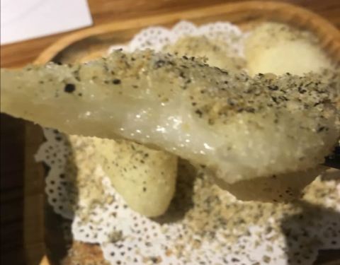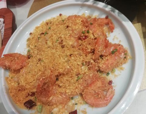 金汤小米狮子头,粥很浓郁,整体偏咸,狮子头很好吃,不油不腻。 辣爆油条虾,有点咸又有点甜,虾还挺多的,油条也有嚼劲,整体不错。 芝麻空心糍粑,外面裹了一圈黑芝麻,甜甜的。 烧汁茄饼,就是家常茄子,做的很好吃,一点不油腻。