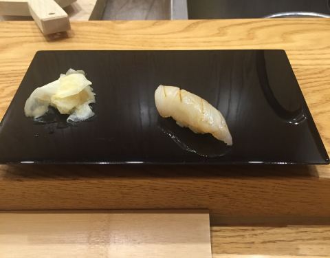 鮨隐·笑鱼,位于云南南路和淮海东路的路口,这是什么神仙美食,隐藏在闹市之中,掀开门帘,典雅的日式木质结构,你会发现只有10个座位,没有菜单,单凭厨师每天的即兴发挥,让你吃到意想不到的美味,如果你不提前预定座位,可能就会白跑一趟了哦。 毛巾、茶水已准备就绪,就等你入座,首先是前菜,被眼前的器皿吸引,小小的卷边有点像荷叶,里面装的是松叶蟹肉,果冻状的是醋冻和莼菜,第一次尝试,原来莼菜也能如此鲜美。 刺身拼盘,单人份的刺身拼盘只有简单的二三样,口感鲜甜的活扇贝、鲷鱼和鰤鱼,都是口感绝佳品。 银鳕鱼西京烧,烤过的银鳕鱼外皮焦脆,呈诱人的金黄色,肉质带着微微甘甜,小小一片,足矣。 黑金鲍配鲍鱼肝酱,鲍鱼肝?emmm。。。当厨师说这上面涂的那层酱汁是鲍鱼肝酱的时候我还愣了一下,听说这黑金鲍很珍贵哦,蒸过后肉质Q弹,配上这酱和少许芥末,绝对的鲜美。 接下来就是十贯手握寿司,店内10个座位几乎满席,厨师精湛的手握寿司技艺,整个品尝过程简直就是一种享受。从刀功、米量控制、形状等都把握得恰到好处,芥末和酱油都直接握在了寿司中。要问我这十贯寿司中,最爱哪种,真的很难说出,每一样都是来自日本新鲜的食材,绝对是吃出了幸福。 吃完寿司,玉子烧也是被小小的惊艳,被烤过的表皮微微酥脆,有点像小蛋糕哦。 最后,用满口甜蜜多汁的网纹蜜瓜来收尾,简直是完美。