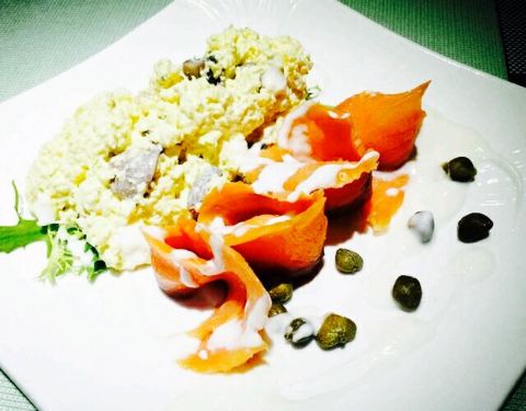 和老板到西站附近请客户吃饭,老板订的这里,这家餐厅地理位置好,大方饭店的B1层,不用坐电梯,从大堂直接走下来就可以。环境真心棒,因为是酒窖,墙壁上陈列了很多红酒,而且沙发神马的非常高大上,十分有面儿。#烟熏三文鱼沙拉# 。三文鱼和蛋黄泥一起,上面淋着沙拉酱,摆盘不错,味道也不错。#奶油蘑菇汤# 。蘑菇是细碎的,奶油味很重,但又不是过份的甜,十分好喝。就餐的整个过程都很清净,特别适合谈事。