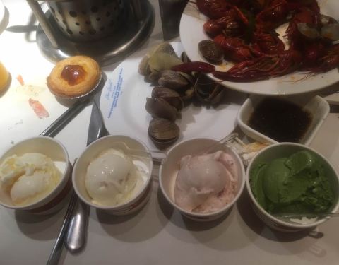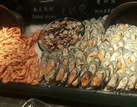 第一次去吃,海鲜类非常多,特别喜欢吃虾,拿了好多,甜点、冰淇淋、烧烤、披萨,种类非常多。