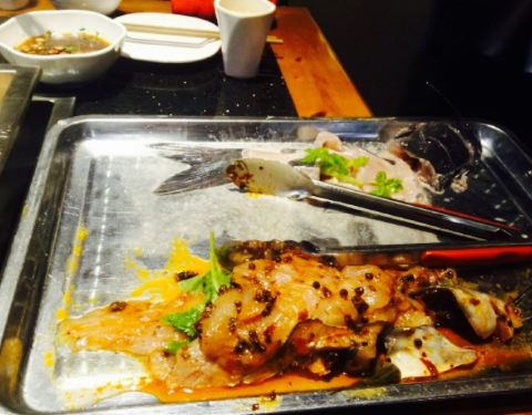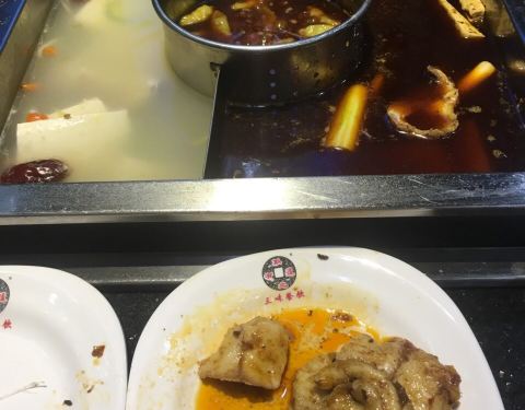 锅底好多麻椒,开心。总觉得麻椒比花椒更香,每次一闻到麻椒的味道就食欲大开。选好鱼后,会先进行腌制,下锅后还有计时器计时,所以煮出去的鱼鲜嫩美味。其他涮菜的味道也不错,重点是锅底和料碗的味道都很好。我们是周六去的,可能现在天太热,所以人并不是很多,只是我并没感受到大家所说的热情服务。期间叫服务生不是不耐烦的说等一下就是干脆无视,让我很怀疑自己是不是很多事。还好邻桌的服务生还比较热心,主动过来帮忙。但是冲着味道还会再去的。