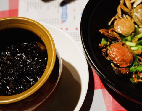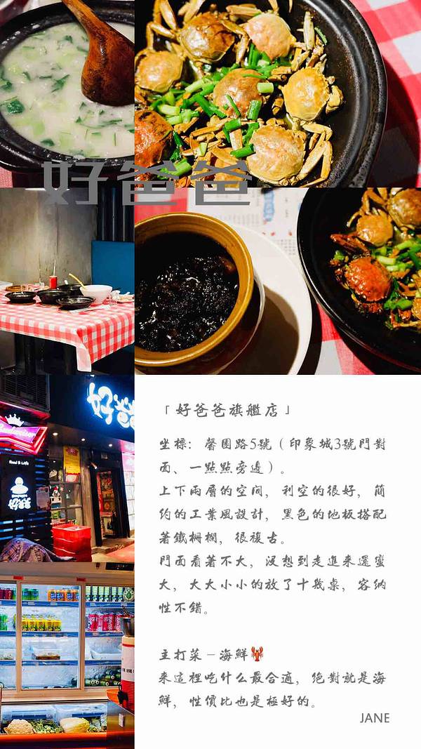 简单搜索了一下,好评如潮,好多吃货都是千里之外赶过来吃的,可见他的魅力了,我们也是百里之外赶来。 坐标:馨园路5号(印象城3号门对面、一点点旁边)周边停车首选印象城。 时间点-晚八点,店铺里面空位子也不多 环境:上下两层的空间,利空的很好,简约的工业风设计,黑色的地板搭配着铁栅栏,很复古。 门面看着不大,没想到走进来还蛮大,大大小小的放了十几桌,容纳性不错。 主打菜-海鲜🦞 来这里吃什么最合适,绝对就是海鲜,性价比也是极好的,而且一楼菜品区都是活奔乱跳的海鲜哦。 现炸豆浆-还是很浓郁的,就是感觉豆渣没有过滤干净,真的好大一扎啊。 马兰-正是这个季节吃的,再过几天就下市了,喜欢吃的快来这里吃吧,里面放了豆干,麻油可以再多放一点哦,就会更香了。 牛肉-怎么可以这么大块,第三顿对于我们来说,已经吃不下了,肉吃吃就撑了,虽然煮的柴了点,但依旧遮不住牛肉本身的味道。 金牌🏅️菜泡饭,这个真的超级赞超级赞 我要为他打电话📲 好好喝,不是粥,就是菜泡饭 沙锅里面现煮的吧,就是很好吃的那种 除了米饭、小青菜🥬还有一点香肠和土豆🥔 然后就变得特别美味了。 梅菜扣肉-不要看着这么小小的一罐,它可深着呢 份量绝对是超级足的,但貌似,梅菜扣肉还是绍兴的好吃,更有劲道一些,应该和做法不同有关系。 重头戏-小霸王 过了吃大闸蟹的季节,那就来吃小霸王吧 个头是真的不大,颜色也不是那么艳红,但是里面的蟹黄是真的多、厚实,虽小,但料足 厨师大大做的很不错,都是沙锅里面炖出来的,这里的黄油特别多,油但不腻。 今晚的第三顿也很满足。 #点评召集令#