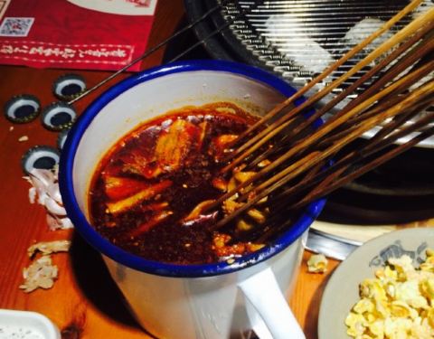家门口新开的这家店垂涎已久,看好评如潮一直想亲身感受下,朋友晚上说馋串儿啦,果断推荐这家。地方稍有些难找,安红街喜家德对面往里走就能看到啦,特色串儿一样点了点,九分熟上来的串,自己现吃现加热一下就好啦,免去了喊人热串的烦恼,小菜儿味道不错,就都是川口的,有些辣,最爱那个口水黄瓜,超级入味,吃过最美味的黄瓜没有之一。由于吃过晚餐来的,不太饿,那个经典的S级牛排和藤椒鲫鱼没有点,下次来品尝,看着就不错。