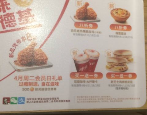 新推出的奥尔良烤翅买一送一到28号一人一次非常合适,薯条给的量也很大,服务也很到位