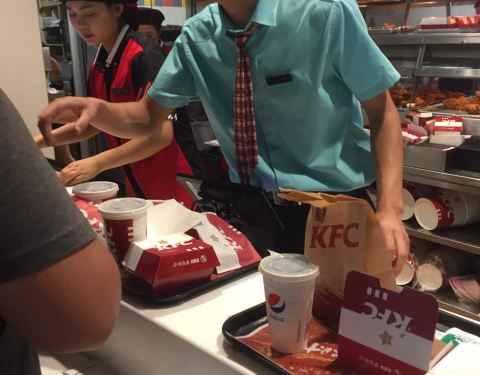 - 店里整体环境还可,即使打扫卫生。KFC的店铺遍布大地千千万。等餐时间不算太久了可以也接受