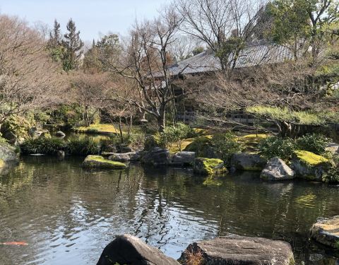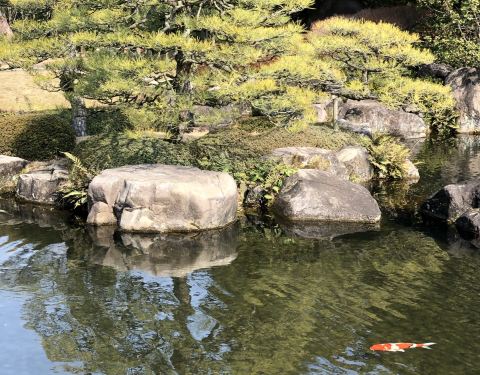 在好古园的御屋敷庭内的池塘边,大幅窗子正对着池塘环境很好
