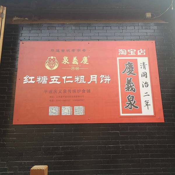 平遥庆义泉炉食铺,创始于清同治2年(公元1863年),自产自销的绿豆糕、油蛋蛋、牛腰腰、油旋饼、粗月饼、黄酒等闻名县内外。