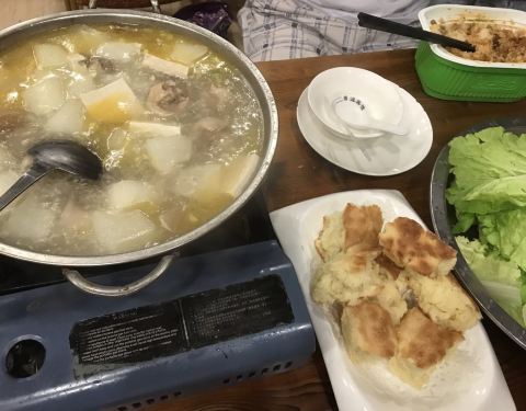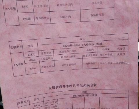 带爹妈到太极会馆吃鸭汤火锅,其实冲着牛骨郭去的,他们不供应了我们只能换鸭汤锅。 这次很奇怪啊,服务员一直在边上说菜单不能拍菜单不能拍,为啥不能拍? 上菜很快,店里直接点套餐和网上团购价格一样的,但是1000积分可以抵扣十大洋那还是团购更划算可以省十块钱呢,套餐里面写了有纸巾,隔壁桌视频里那几位仁兄问服务员要,服务员说2块钱一包,他们说套餐里面含,服务员就说怎么可能呢,纸巾都是另外付钱套餐里没有,说了半天服务员就是咬定纸巾要钱,我和爹妈本来随身也会带也就没有去交涉了,但是我把团购详情图放上来,写的很明确是免费提供的,服务员应该更清楚自己店内活动不要睁眼说瞎话了。 鸭子确实很少,六七块,个头也很小,白萝卜和冬瓜很多,被很多人夸的火烧馍不就是山下2块钱一大个的饼撕开成一块一块嘛?我们都买了一个带上山怕半夜饿准备用来过泡面和鱼肉肠的,整个餐厅不开空调,门一开一股冷风蹿进来,爬了山本来就出了一身汗的,坐下吹冷风真是够了,好在是喝热汤,炒菜一会就要冷了。 吃完去收银台想开发票,那边空着,几个服务员都围在那里聊天,看见我们在那里站着,没人过来就那样隔着七八米看着我们,真是太有意思了,明年去武当山这店不会去了。