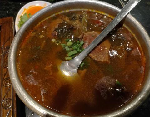 合合大冷面立山区店位于中华路鞍钢体育馆北100米路边,每次去他家都要提前订座位,不然就得排队等位置,非常火爆。他家的黑椒小牛扒 大块肉,羊肋条都很好吃。烤好的羊肉串,小花卷味道也不错。