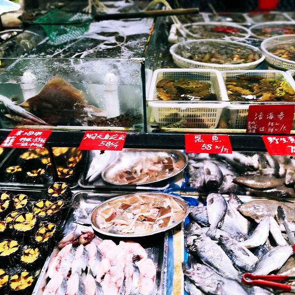 旺角小渔村是我在网上找到排名较高的一家店,走进店里还看到墙上还挂着网友最喜欢的餐厅的招牌,看来是一家网红店哦。山东人民的网红店,还真的不太注重外在美,应该说内部装修很接地气。点菜的地方都是生鲜海产,看了就让人开心。食材上面都有明码标价,让人吃的放心。这一回,我们点了山东著名的鲅鱼水饺,水饺很霸气,一个就有差不多拳头大小。还点了鲍鱼,我们南方的鲍鱼都是按个儿卖的,这里的鲍鱼一上一大盘。葱烧海参特别好吃,应该是我吃过的海参里味道最好的。我还点了这里著名的疙瘩汤,疙瘩汤里的疙瘩都很小颗,不像我们南方的面疙瘩,都有手指粗细,很美味的一餐,至今还在回味。