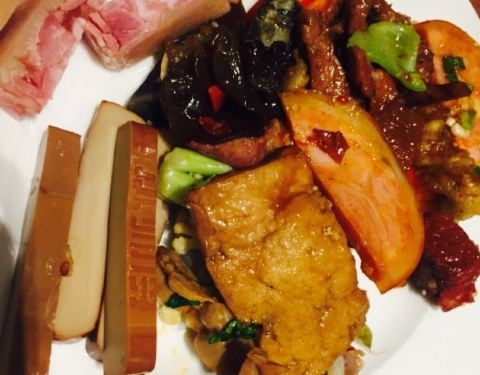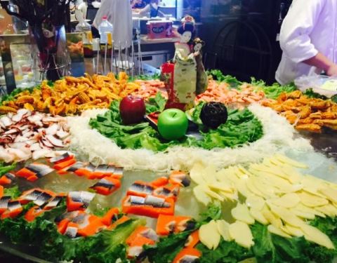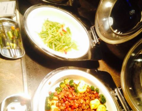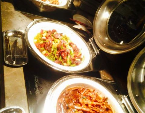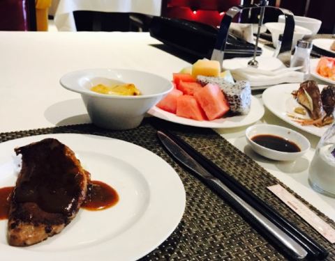 说实在的进到酒店里面感觉好浮夸,太高大上了。还是来说菜品吧。蒜蓉粉丝带子,希望换做法,蒜蓉粉丝太普通,不符合酒店的格调。鲍鱼黑猪肉包子,没吃。材料蛮贵的。减肥不吃主食。牛排和虾,每人标配。生鱼片,生鱼片品种也挺多。北极虾不错。火锅,没吃不评价。烤肉,没吃不评论。饮料,建议喝汇源果汁或者酒。水果,都蛮入味的,甜点区有杨枝甘露,泡几个水果进去就是超级入味的饭后甜品。双皮奶可以点个赞。希望吃到更多创意菜品。个人一点小建议。