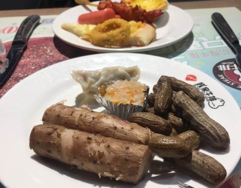 中午来的,还没有排队,牛排分量不大但挺嫩的,自助的种类也比较少,披萨还不错,水果还算新鲜,但好吃的不多,在台湾吃过,那边的牛排分量很大,菜品种类很多,很火爆,所以看到这边也有就赶紧来吃了!图2是儿童餐,图4是台湾的分量