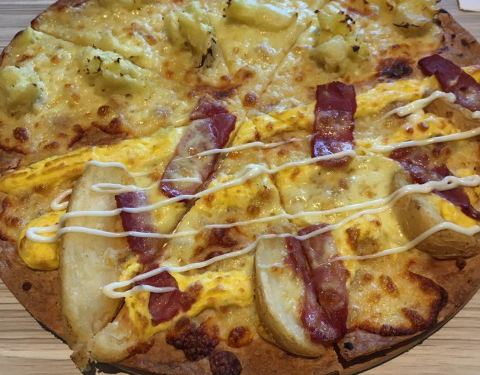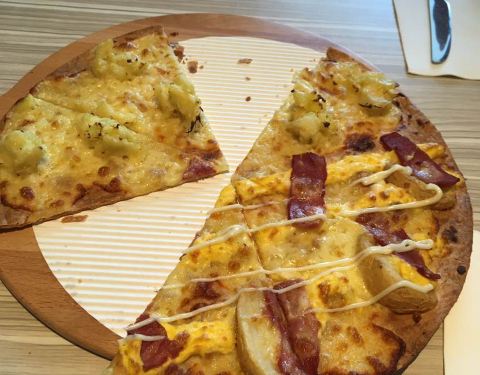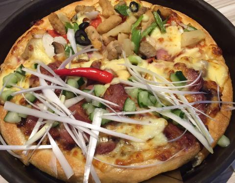 这次出的薄饼披萨很适合不喜欢很厚皮子的人群。小孩也吃得很开心。里面的甜品可以选择。鸡翅炒饭之类的不建议都有点偏辣。小孩子都不吃。味道可以。环境很好。值得再去