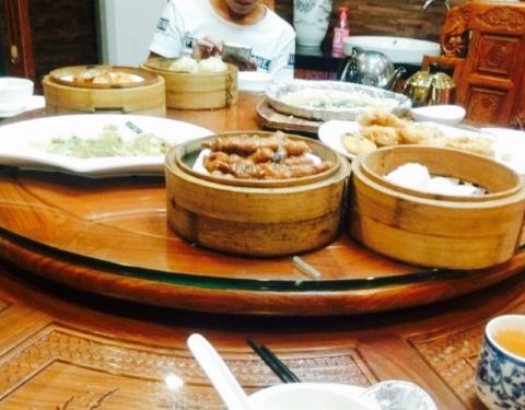 环境不错,我特别开心。来了第二次了。茶点点心也特别入味,这几样是我最开心的。紫菜卷肉,客家苦瓜酿肉。虾饺,金针菇饺。金钱肚。这几样是我的最爱。吃完肉还得记得吃上一碟广东菜心哦。最后一张是茶具套装,...