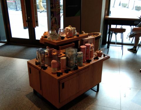 小伙伴在这里买咖啡,拍照走起走起。 看见了猫头杯,囧,是猫头杯吧?有耳朵,有脑袋轮廓,外面还画了个嘴。 感觉这个也很可爱啊,怎么没有人抢呢?反正我是买不起的,我价格都没有去看就怕打击到自己。