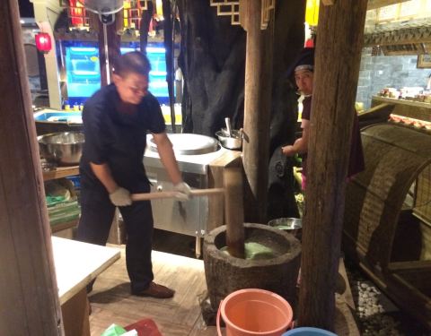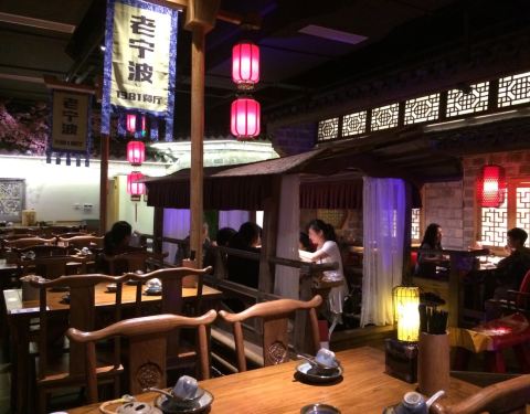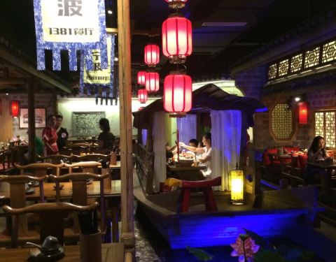 老宁波1381餐厅(东岸里店)位于江东区银亿东岸里(柴家漕巷71号),走进店里,有种仿佛迈入近代史博物馆的既视感,各种店铺,钱庄,小桥流水人家,土气土气的原装石磨,居然还有好几条小船,如果客人足够多,还有点...老宁波1381餐厅(东岸里店)位于江东区银亿东岸里(柴家漕巷71号),走进店里,有种仿佛迈入近代史博物馆的既视感,各种店铺,钱庄,小桥流水人家,土气土气的原装石磨,居然还有好几条小船,如果客人足够多,还有点庙会的意思。 菜品有宁波风味的海鲜,也有农家菜,比如当场制作的豆腐皮,现打的青团,带着小朋友增加知识也是很不错的,满满的文化韵味,原来老底子的小吃都是这么做出来的,很多年轻人都其实没真正见过。 点菜的也蛮有意思,到了一家店铺选择心仪的菜品对应的竹签,放入专用的木制提桶即可,到了餐桌交给小二,就等着上菜了。 菜品味道也还可以,价格适中,三个人点了红烧肉、手工豆腐、糯米饭,基本都吃不光了,表示撑死。 如果一家人,可以选择在船上用餐,六人位置,其乐融融,不足为外人道也。