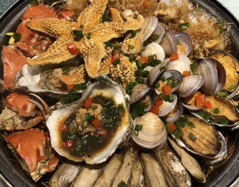 店里菜品多,海鲜种类齐全,宁波特色菜,人很多,有支付宝买麻糍活动