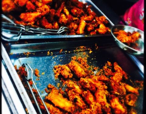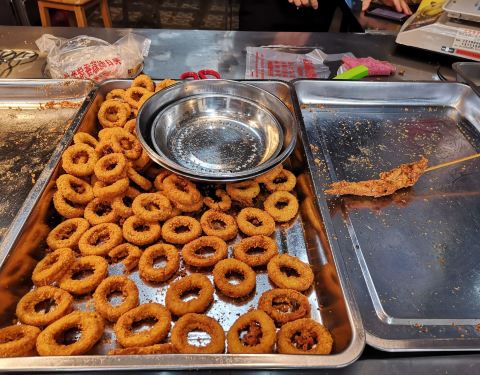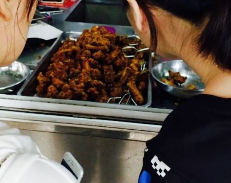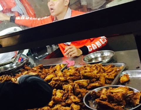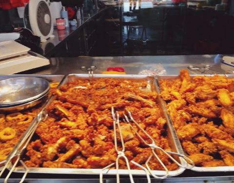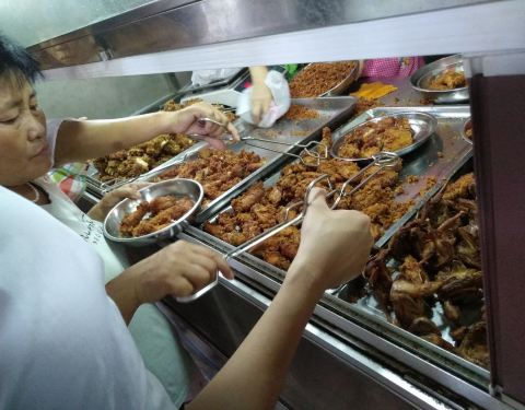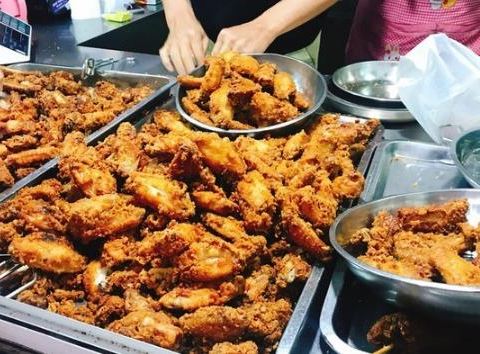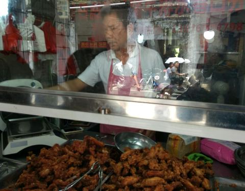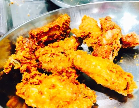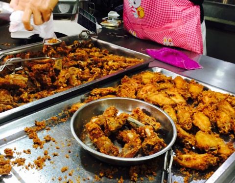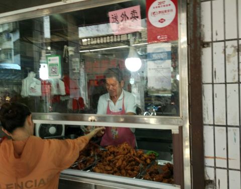 这家店不讲究排队,附近的居民也会来所以不存在坑骗游客这种情况。 我描述一下我的抢购经历:我以为是排队买,就去窗户边排队,然后发现有人进人群就开始挑自己用夹子挑选食品),我就问前面的人是不是需要排队。一位孕妇告诉我“抢到夹子就可以”,说实话我就是没经验,以至于等到前面的人把夹子给我,又没有盘子装,总之买了40块钱的炸排骨和炸鸡翅出了一身汗。 炸鸡翅,90分;炸排骨,牙口不好就别吃了。