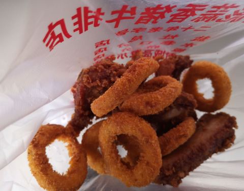 因为这里的猪扒还有洋葱圈都想试一下,所以就每样东西都要了一点,其实这里的东西价格还是蛮贵的,就那么点东西,加起来就要几十块钱了。 在这边的猪扒的确是相当的脆,刚好可以放到陈记汤饭里面拌着吃,而且的话...因为这里的猪扒还有洋葱圈都想试一下,所以就每样东西都要了一点,其实这里的东西价格还是蛮贵的,就那么点东西,加起来就要几十块钱了。 在这边的猪扒的确是相当的脆,刚好可以放到陈记汤饭里面拌着吃,而且的话,这边的口味也是提前调教好的,所以入口就比较的清爽,但是因为特别的新鲜,所以很容易上火。