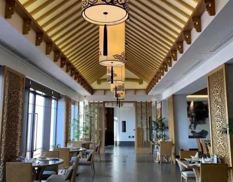 黄山悦榕庄酒店里面吃自助早餐的餐厅,环境不错,可以坐在室内,也可以在外面,望着周围的群山,自助早餐还挺丰富,服务很到位。