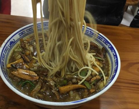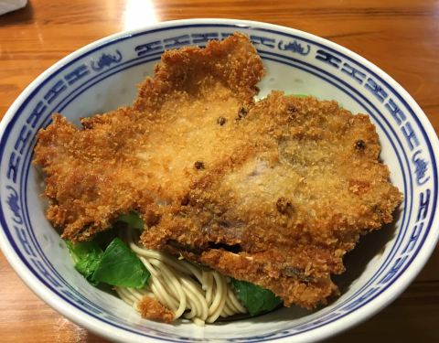 炸排骨葱油拌面、排骨现炸的、很赞。排骨腌渍的时候添加了花椒、所以吃起来酥脆带麻。拌面也不会过油过咸。