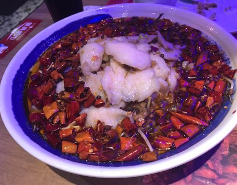 点了麻辣干锅牛蛙、沸腾鱼和红糖糍粑,麻辣干锅牛蛙里有厚土豆、年糕、黄瓜,牛蛙肉真的很好吃,紧致细嫩有弹性,年糕外层是炸过的,一层脆脆的壳,黄瓜不太入味,应该用拍黄瓜。沸腾鱼无功无过,肉质也算细嫩。红糖糍粑是用米做的,炸脆外壳后沾红糖酱吃,当主食,没有吃完已经很饱了。