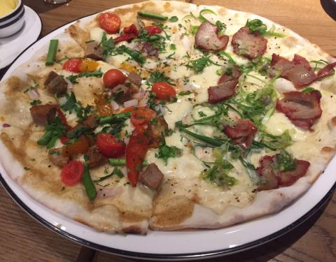 环球金融中心这家店就在二层连廊的口边上 整个店面环境也还算不错 也有一定室外的空间可以坐 最喜欢的还是这里中午68的套餐 一个披萨加鸡翅还有饮料不算很贵 因此中午这里的人气也会很足 店里的北京烤鸭披萨味道很不错 很喜欢氛围和环境