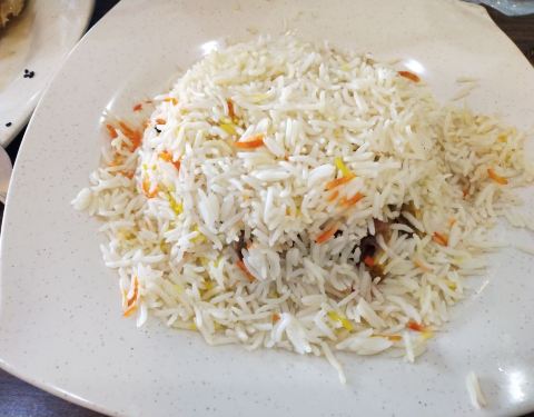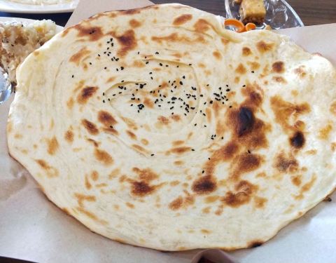 烤鱼有点辣,味道不错,烤饼有嚼劲,和新疆的囊有点像,热的时候很好吃,另外一个饼浇了蜂蜜,有些腻,最后一个是炸的甜点,太甜了,只能吃一两块,饭是羊肉的,我不吃羊肉,老公说味道不错。
