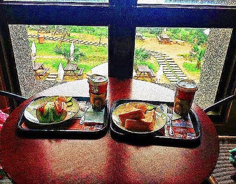 說真的餐點很不怎麼樣,但是以這個價錢算很值得才60元人民幣一客排餐(如圖)還含飲料,但是這個景真的是太美了,午後選個窗櫺的位置,看著宜蘭海岸線,什麼煩躁都忘掉,拿鐵咖啡還可以,點了一杯蔚藍海岸咖啡,...