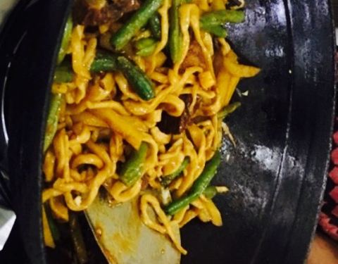 开往回京的路上 。找寻晚饭 。恰好在国道上开 。在网友攻略上发现这家焖面 。评价还挺好 。就下道往里开 。挺好找的 。饭点儿人还挺多 。店家有些忙不过来 。自己写的菜单 。上菜也有点慢 。排骨豆角焖面 。上了一个大铁锅 。还真香 。尤其配上腊八蒜和腊八醋 。里边的洋芋也入味。