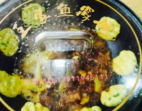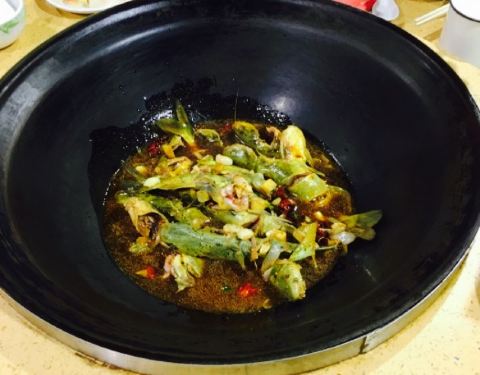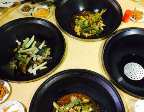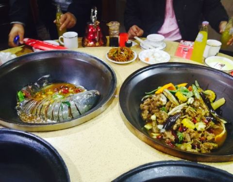 装潢风格比较复古,陈设比较精美,大厅中间是水池,吃那条现捞,两边是包间,很有特色。桌子上两口大铁锅,看的人很有食欲,五个人选了一条鱼,几条黄辣丁,里面加入豆腐,洋芋,粉条,茄子等配菜,一起放入铁锅...