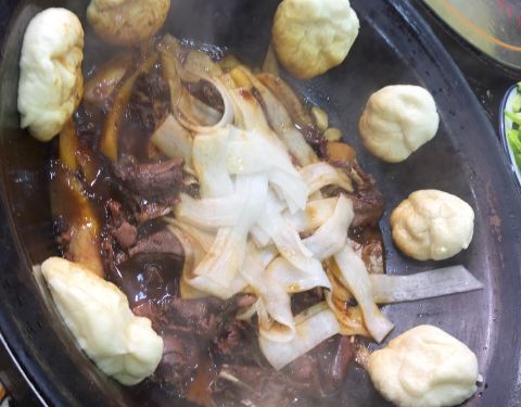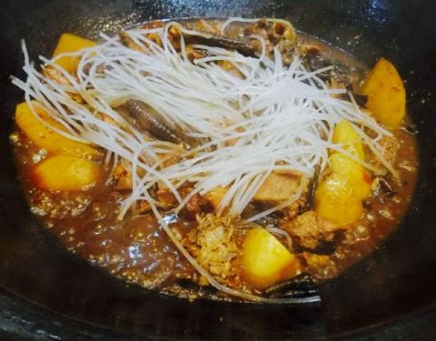 ...,粉条,茄子等配菜,一起放入铁锅,加盖现炖,甜香,吃起来真是不错,辣味的锅底还是可以,推荐尝尝