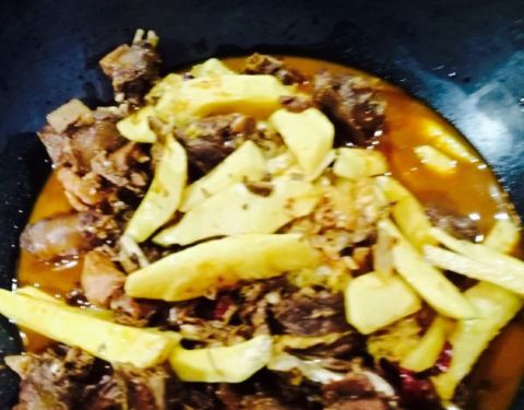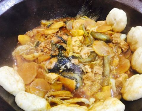 好鲜的鱼呀!下锅时,它还在“喘气”呢!鱼身上这么多刀,肚子也被掏空了,它还在“喘气”呢!鱼是真鲜,柴锅一炖,加上豆腐、茄子、粉条,锅边再贴上玉米饼或花卷,盖好锅盖,炖上二十多分钟,时间一到一揭盖,真是香呀,汤咸鲜,鱼有味,美赞!
