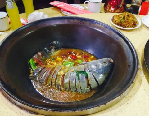 装潢风格比较复古,陈设比较精美,大厅中间是水池,吃那条现捞,两边是包间,很有特色。桌子上两口大铁锅,看的人很有食欲,五个人选了一条鱼,几条黄辣丁,里面加入豆腐,洋芋,粉条,茄子等配菜,一起放入铁锅...装潢风格比较复古,陈设比较精美,大厅中间是水池,吃那条现捞,两边是包间,很有特色。桌子上两口大铁锅,看的人很有食欲,五个人选了一条鱼,几条黄辣丁,里面加入豆腐,洋芋,粉条,茄子等配菜,一起放入铁锅,加盖现炖,甜香,吃起来真是不错,辣味的锅底还是可以,推荐尝尝。
