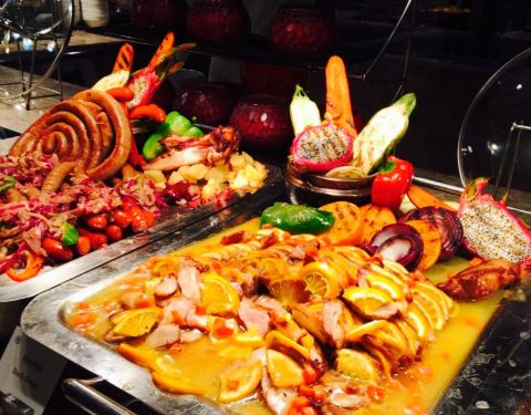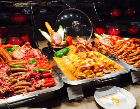 按照五星的自助标准来说只能算及格,螃蟹比较小,蟹腿基本没什么肉,三文鱼区的东西没感觉比蓝海高级到哪儿去。羊排和牛排想对新鲜,糕点做的还可以,其它的热菜水果没什么优点,倒是冷拼区那些火腿看着还过得去...按照五星的自助标准来说只能算及格,螃蟹比较小,蟹腿基本没什么肉,三文鱼区的东西没感觉比蓝海高级到哪儿去。羊排和牛排想对新鲜,糕点做的还可以,其它的热菜水果没什么优点,倒是冷拼区那些火腿看着还过得去。如果按照综合性价比,这个价位还算划算。毕竟五星酒店自助120多全国也没几家。趁着便宜都可以来拔拔草。