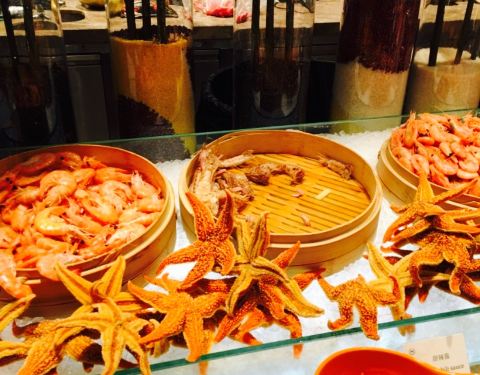 按照五星的自助标准来说只能算及格,螃蟹比较小,蟹腿基本没什么肉,三文鱼区的东西没感觉比蓝海高级到哪儿去。羊排和牛排想对新鲜,糕点做的还可以,其它的热菜水果没什么优点,倒是冷拼区那些火腿看着还过得去...